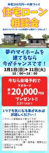 来店予約プレゼント クオカード20,000円分 イベント 住宅ローン相談会 日時 3.1(日)~ 3.15(日) 開催場所 埼玉県比企郡嵐山町平澤2620