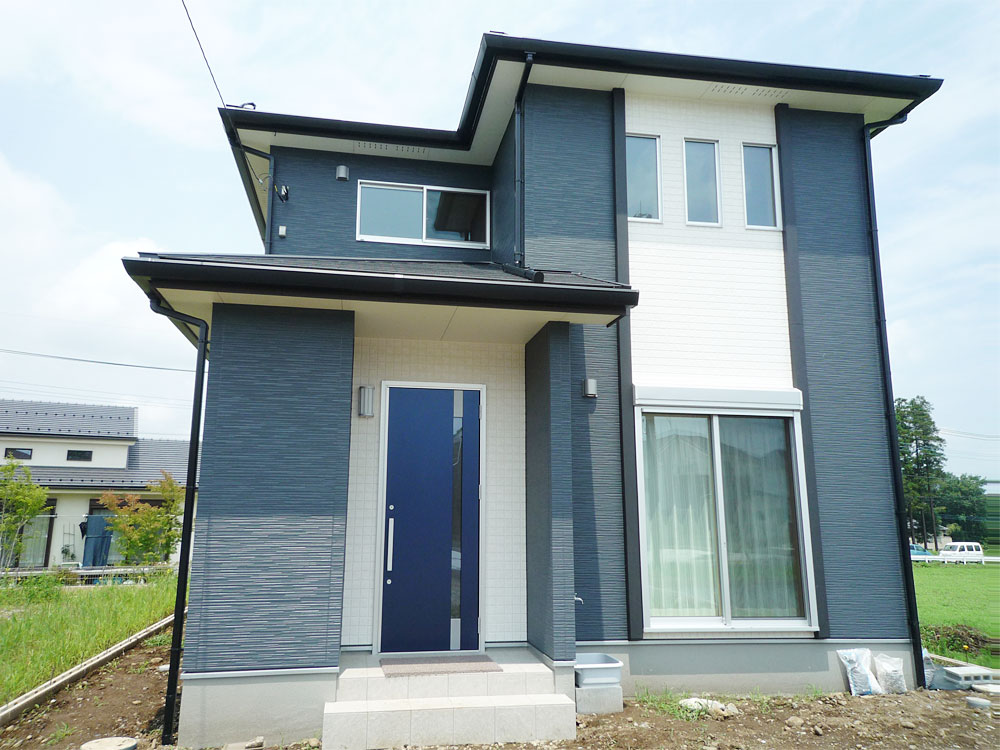 2色の外壁を貼り分けました。青い玄関扉が素敵です