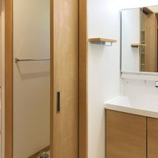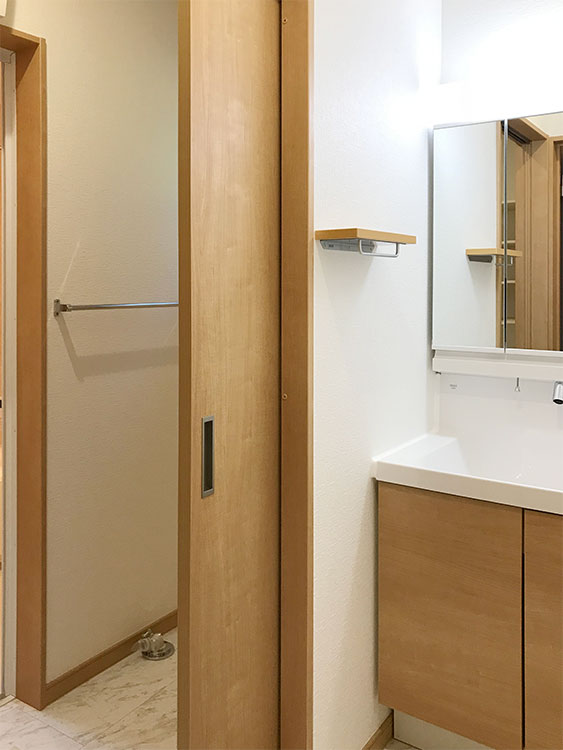 洗面所と脱衣所は扉で仕切りました。誰かがお風呂に入っていても気兼ねなく洗面所を使えます。