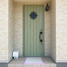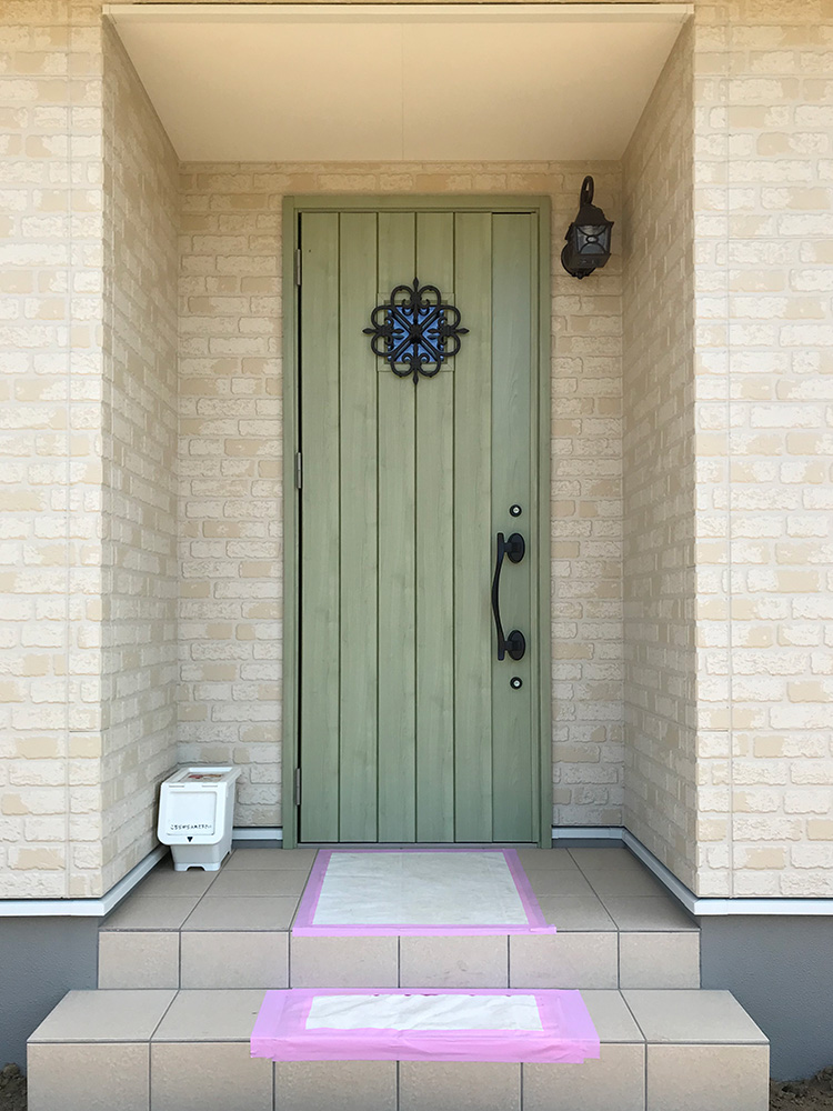 白い外壁に映える優しいグリーンの玄関ドアです