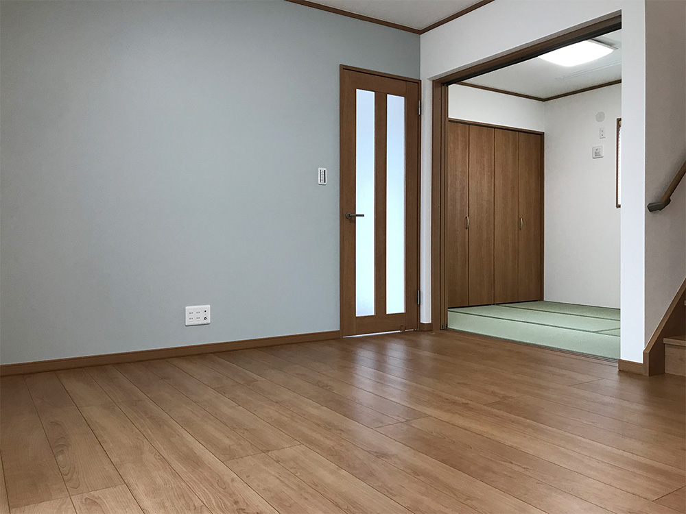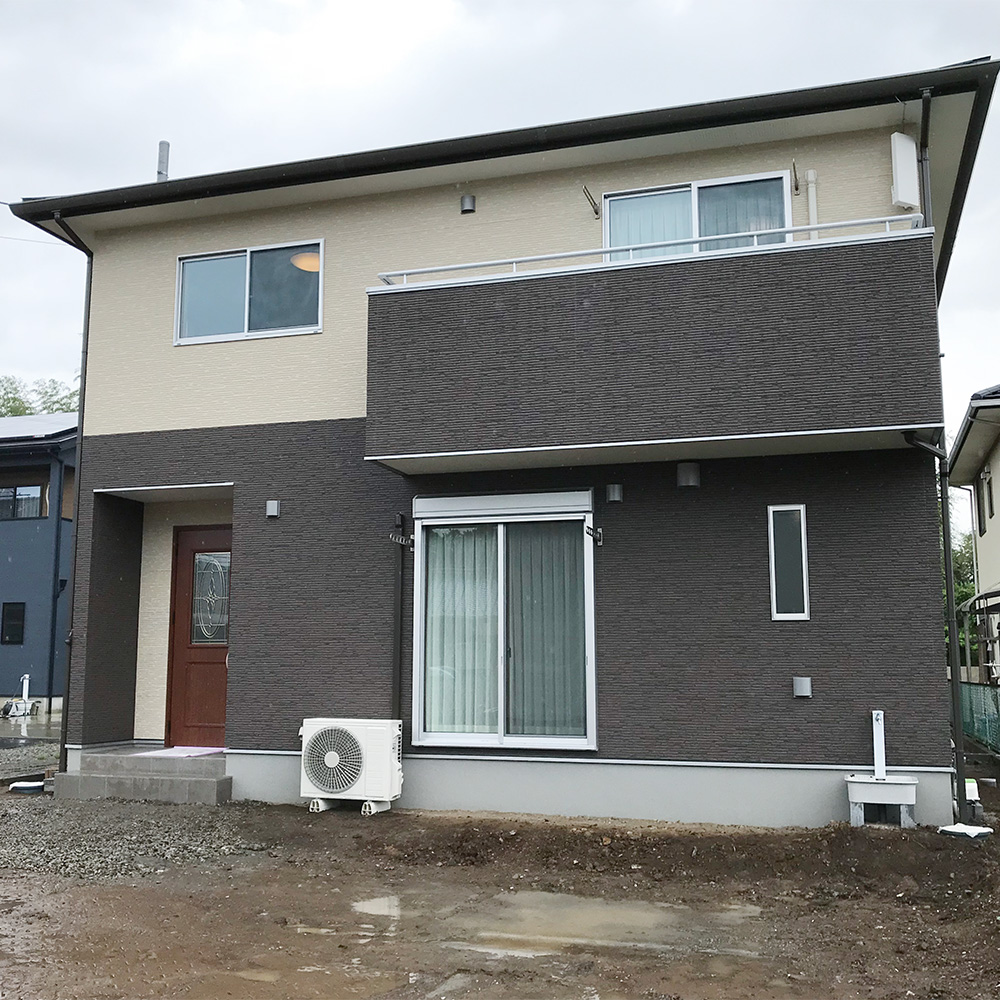 二色の外壁を貼り分けました 玄関ドアはデザイン性があり採光も取れます