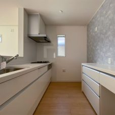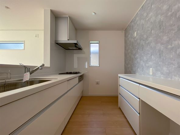 カップボードは引き出しタイプで使い勝手も◎ゴミ箱スペースもあります
