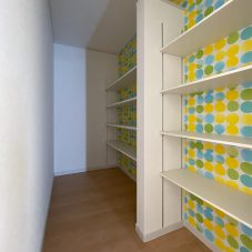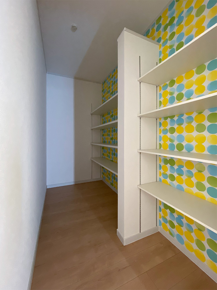 カラフルなアクセントクロスを使用し明るい気分になるパントリー 大容量なので買い置きなどたくさんストックできます