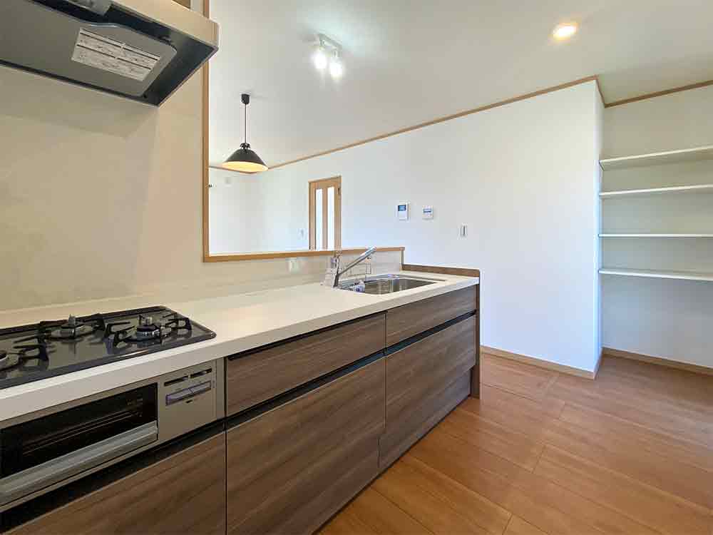 キッチンの横にはパントリーを設置 可動棚なので高さが変えられ便利です
