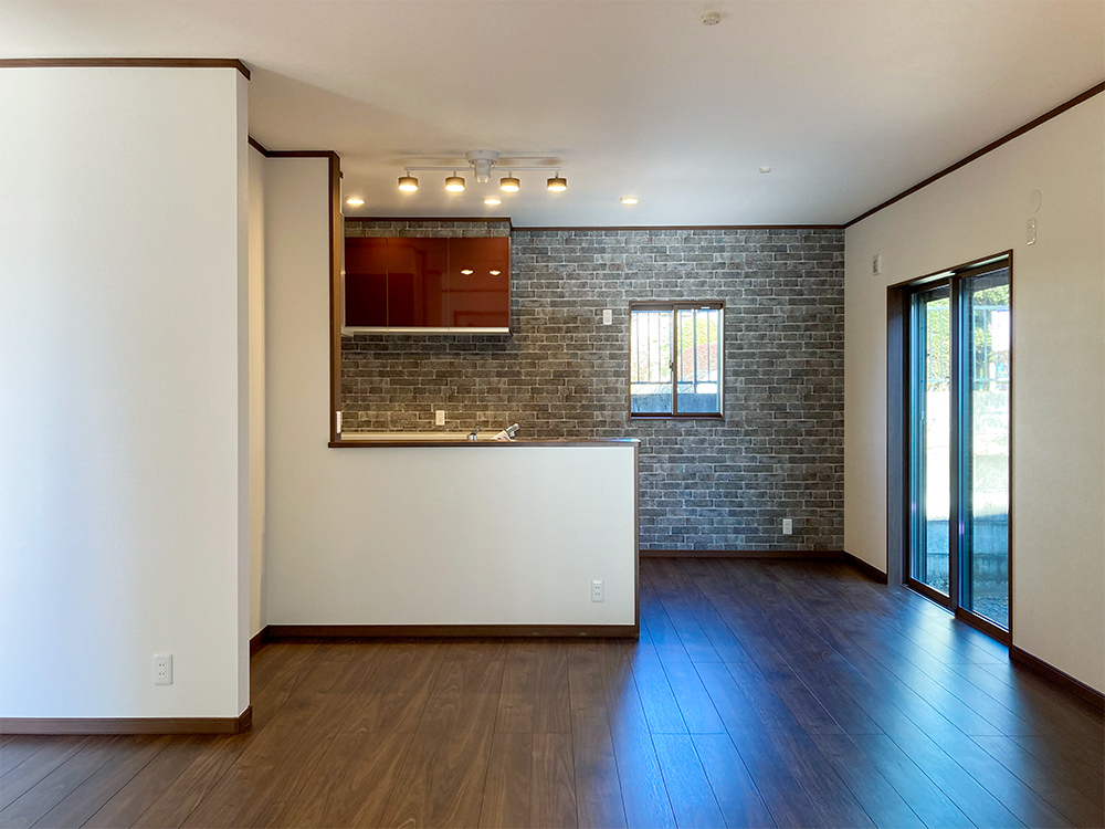 キッチンの壁一面にタイル柄のアクセントクロスを貼りました リビングに入ると目をひきます