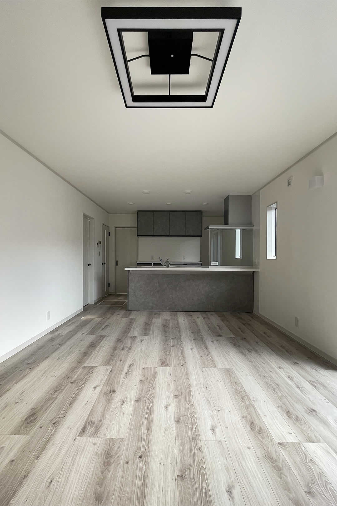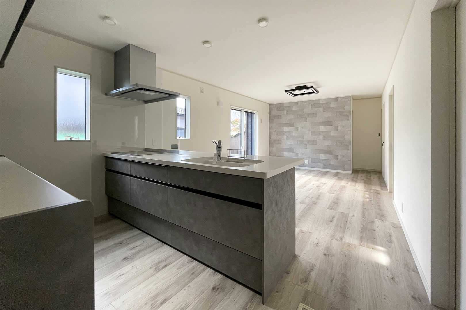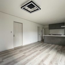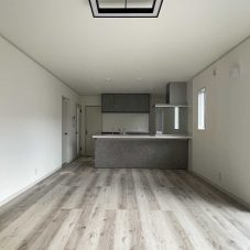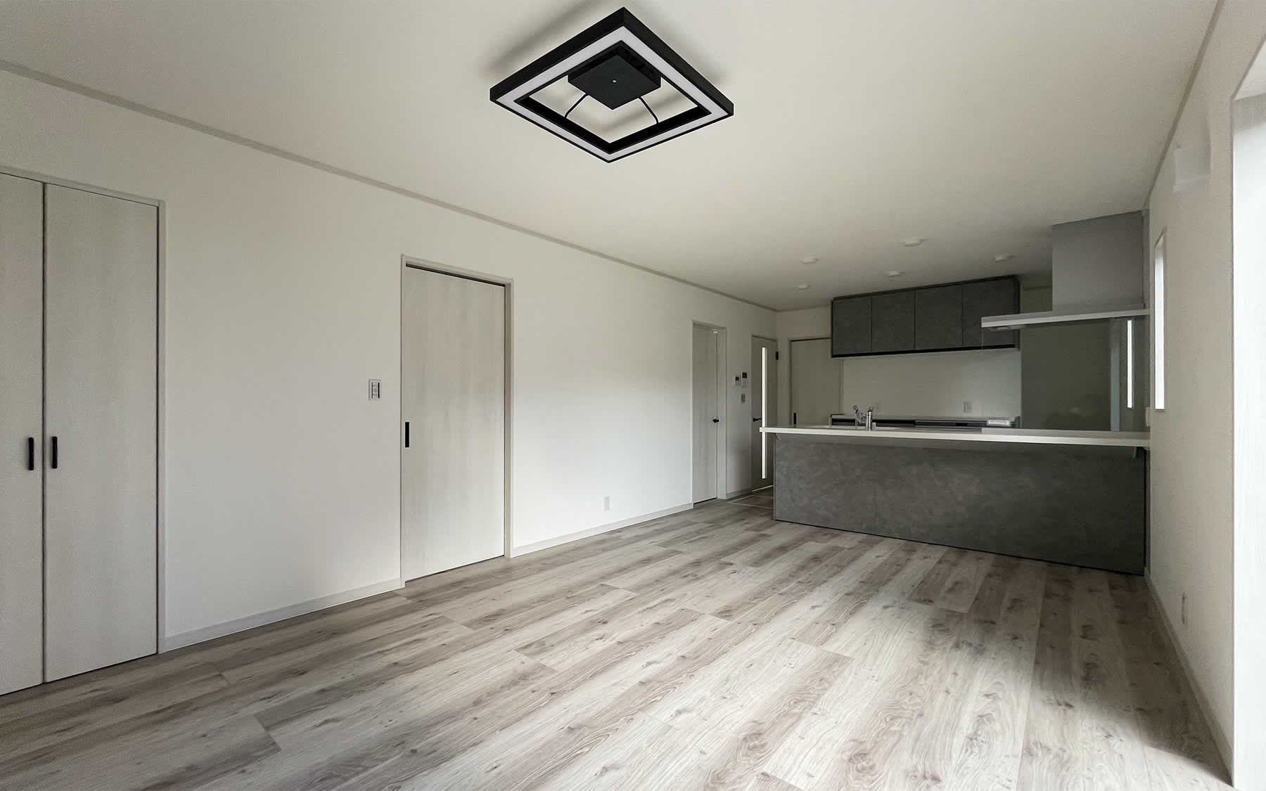 建具や床は白い木目調で優しい印象のリビング。オシャレで飽きのこない空間でどんなテイストにも合わせられます。グレーのキッチンの色が引き立ちます。