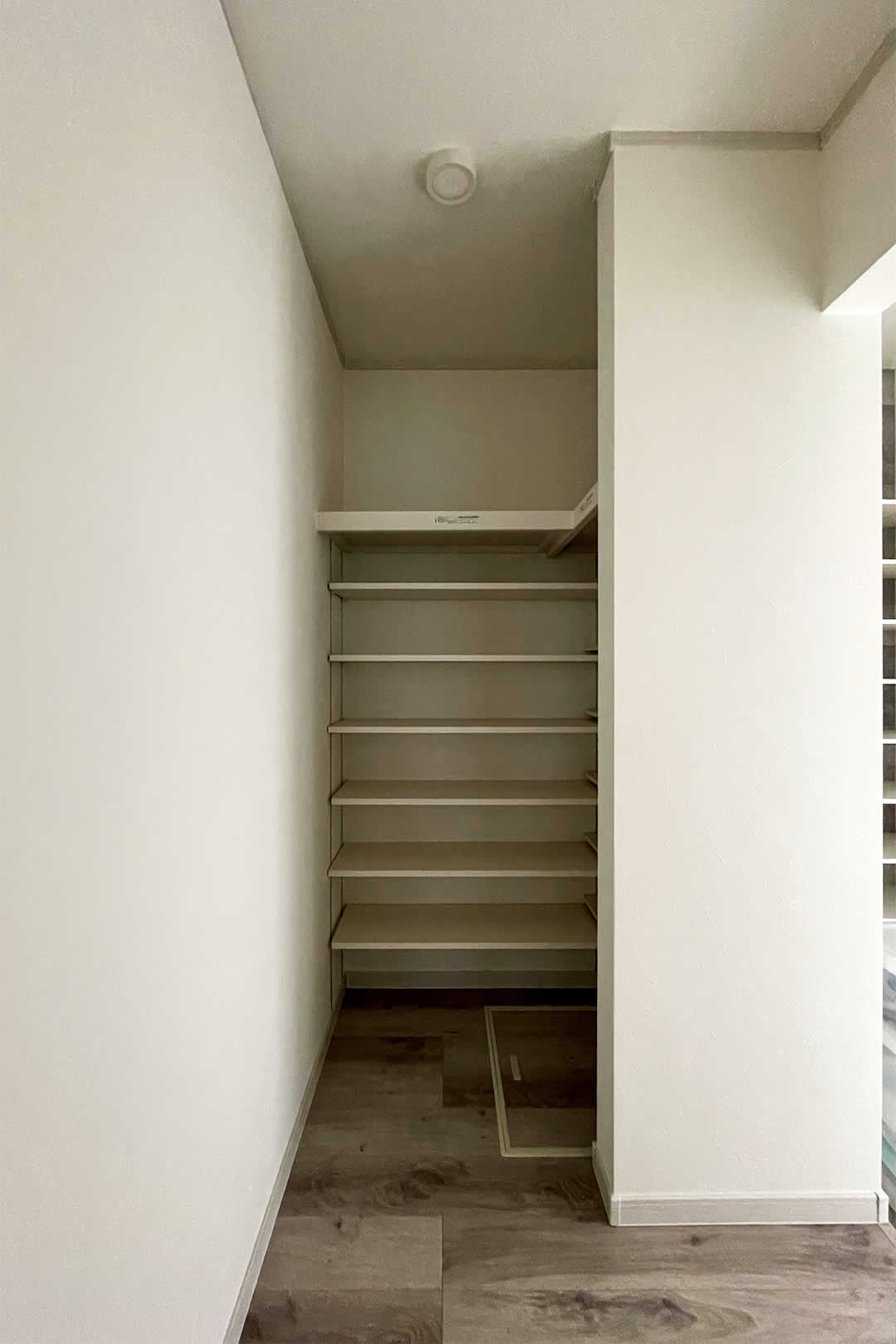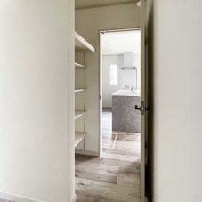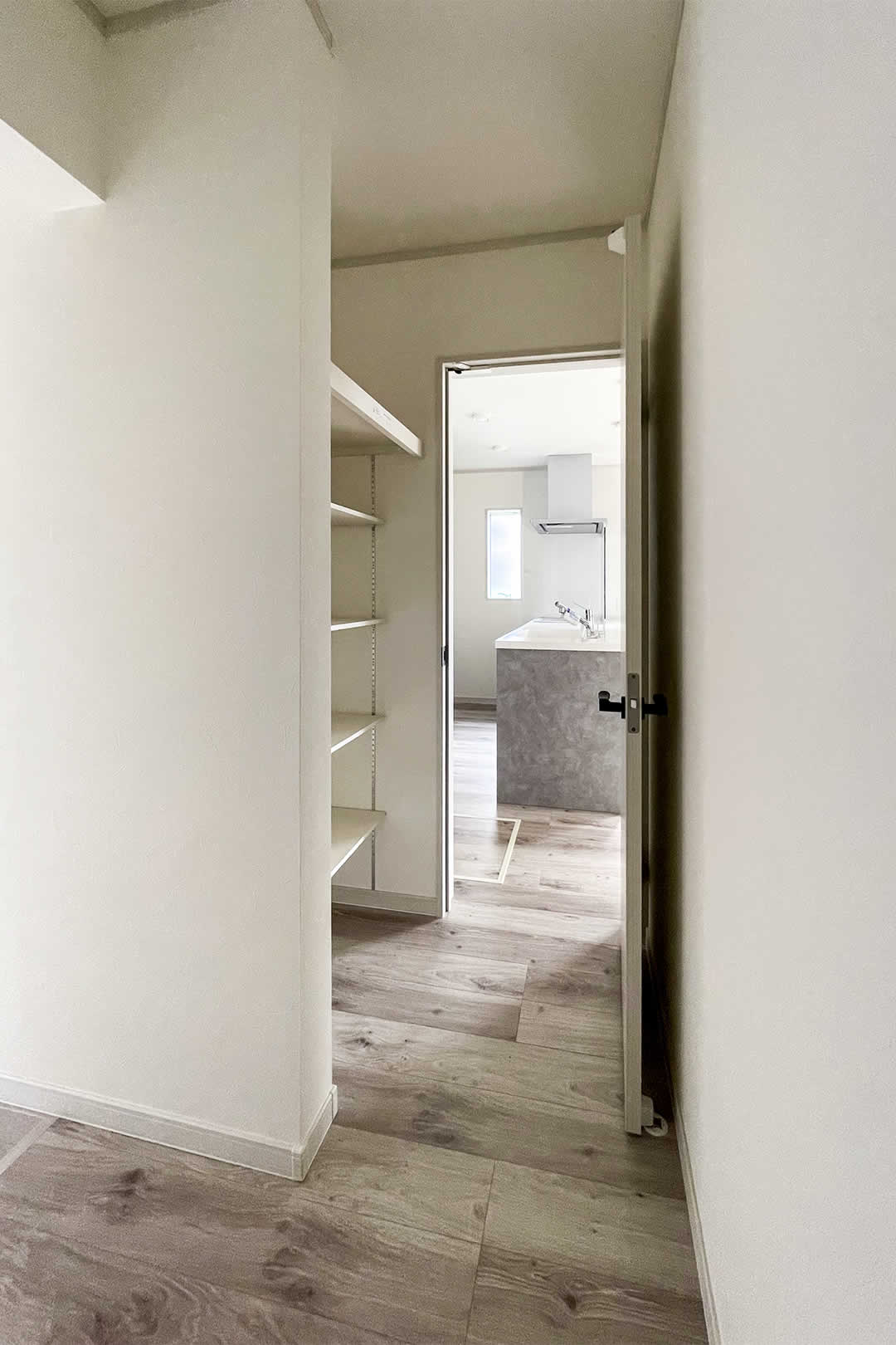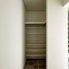 キッチンの横には大型のパントリーを設置。出し入れにストレスなく在庫の把握もしやすいパントリーには、買い物から帰ってきて直接収納できます。