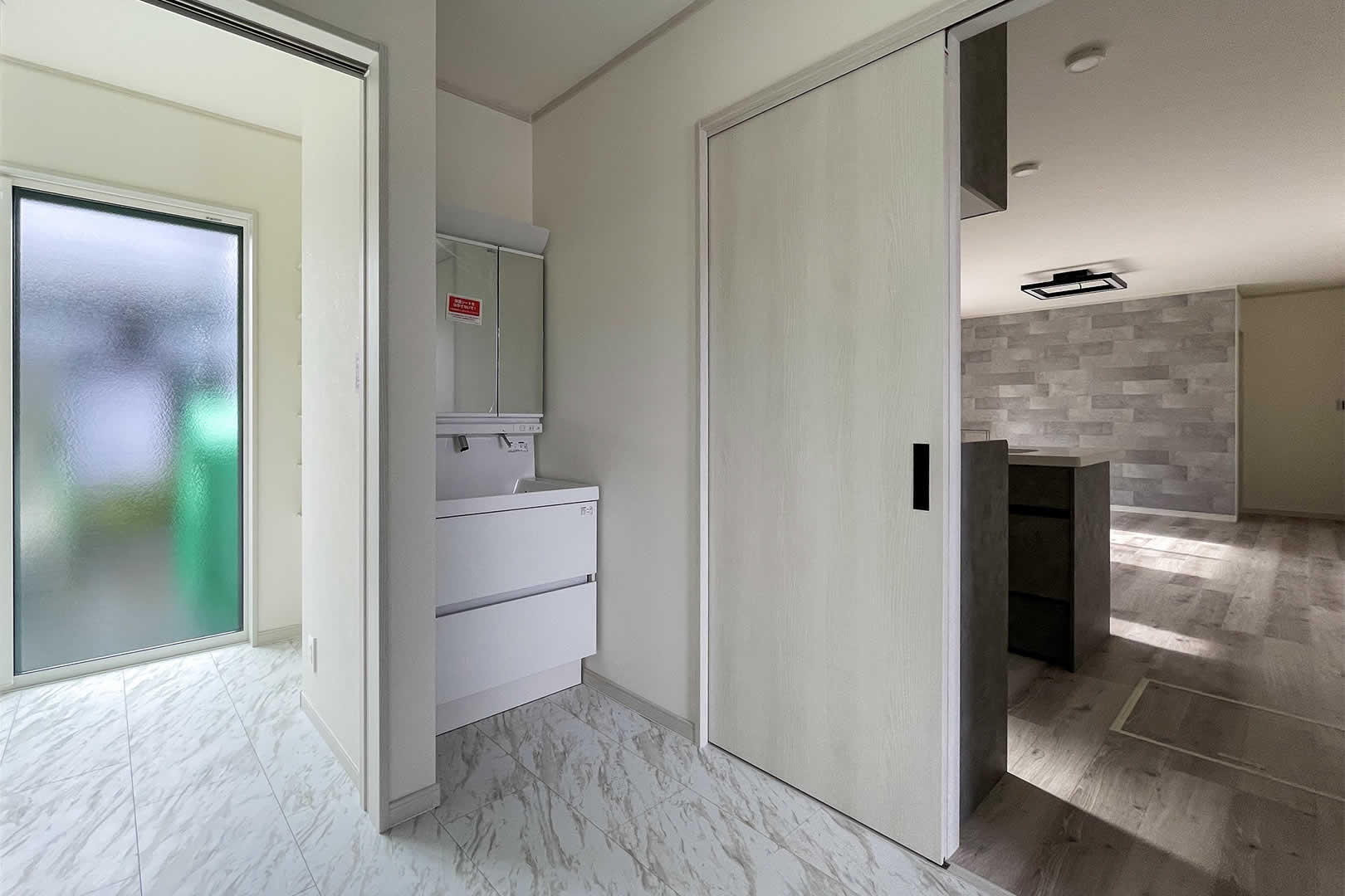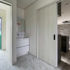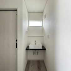 足元がスッキリしていて圧迫感のない洗面台は帰宅してすぐ手洗いうがいをするために設置しました。
