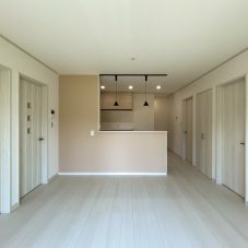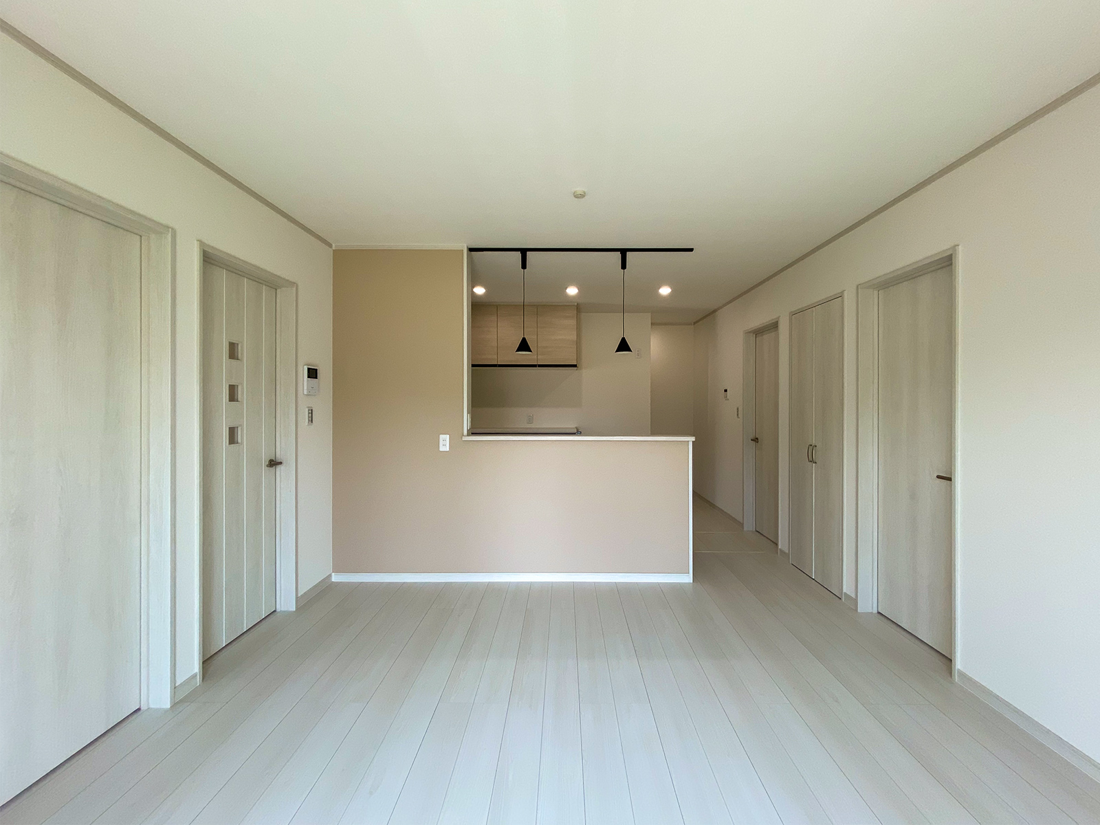 明るいLDK キッチンのペンダントライトがおしゃれです