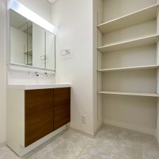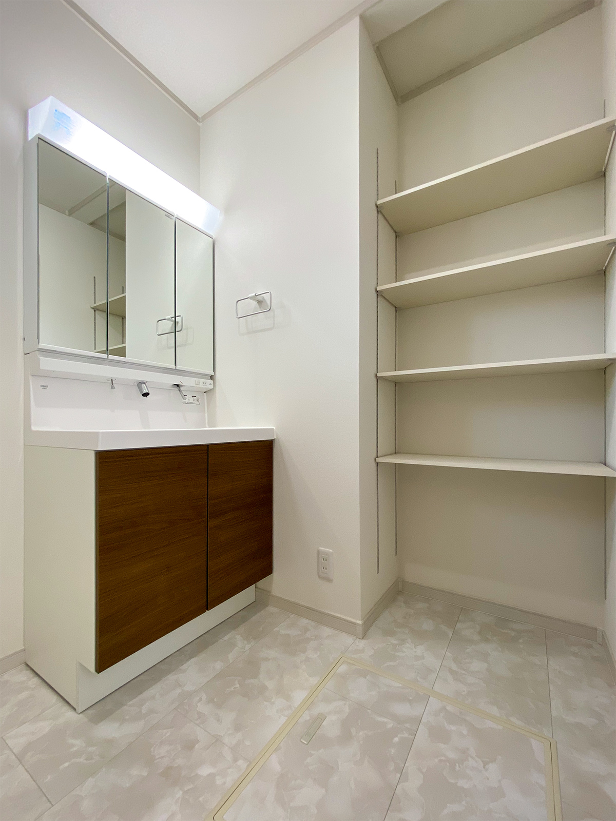 広々洗面台は三面鏡になっており鏡の後ろもたくさん収納できます 棚には洗剤や家族の着替えなどしまっておけます