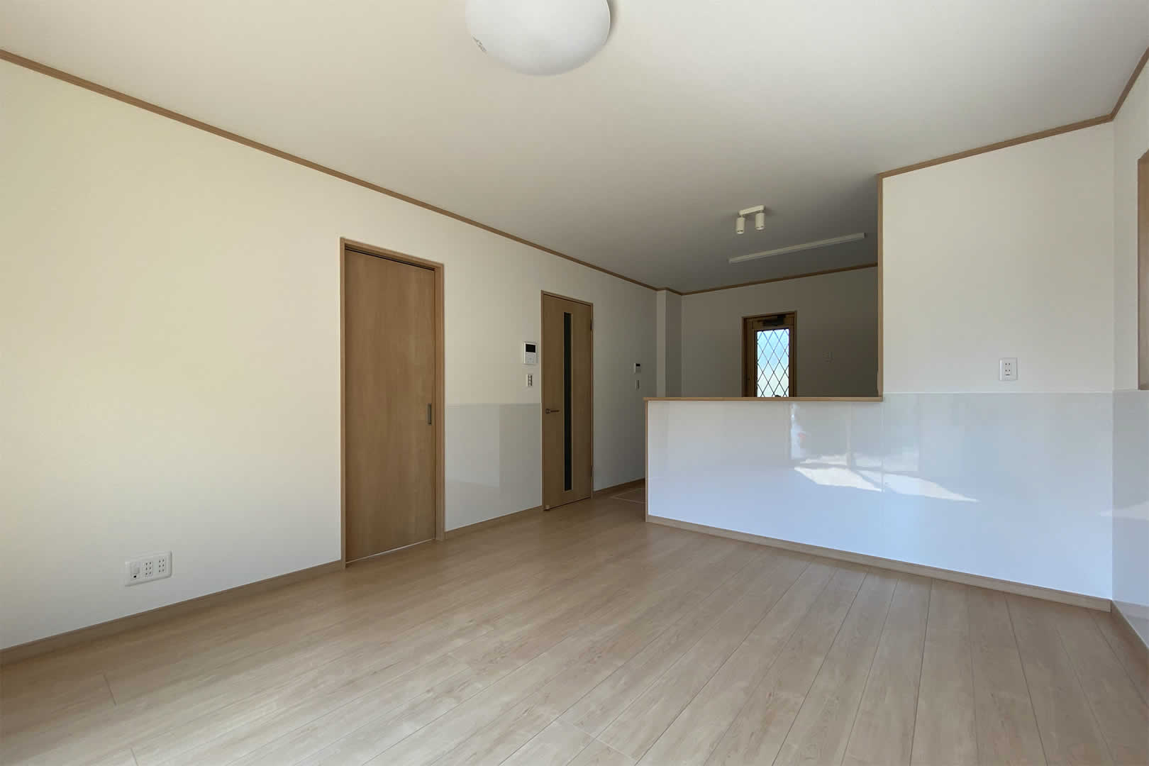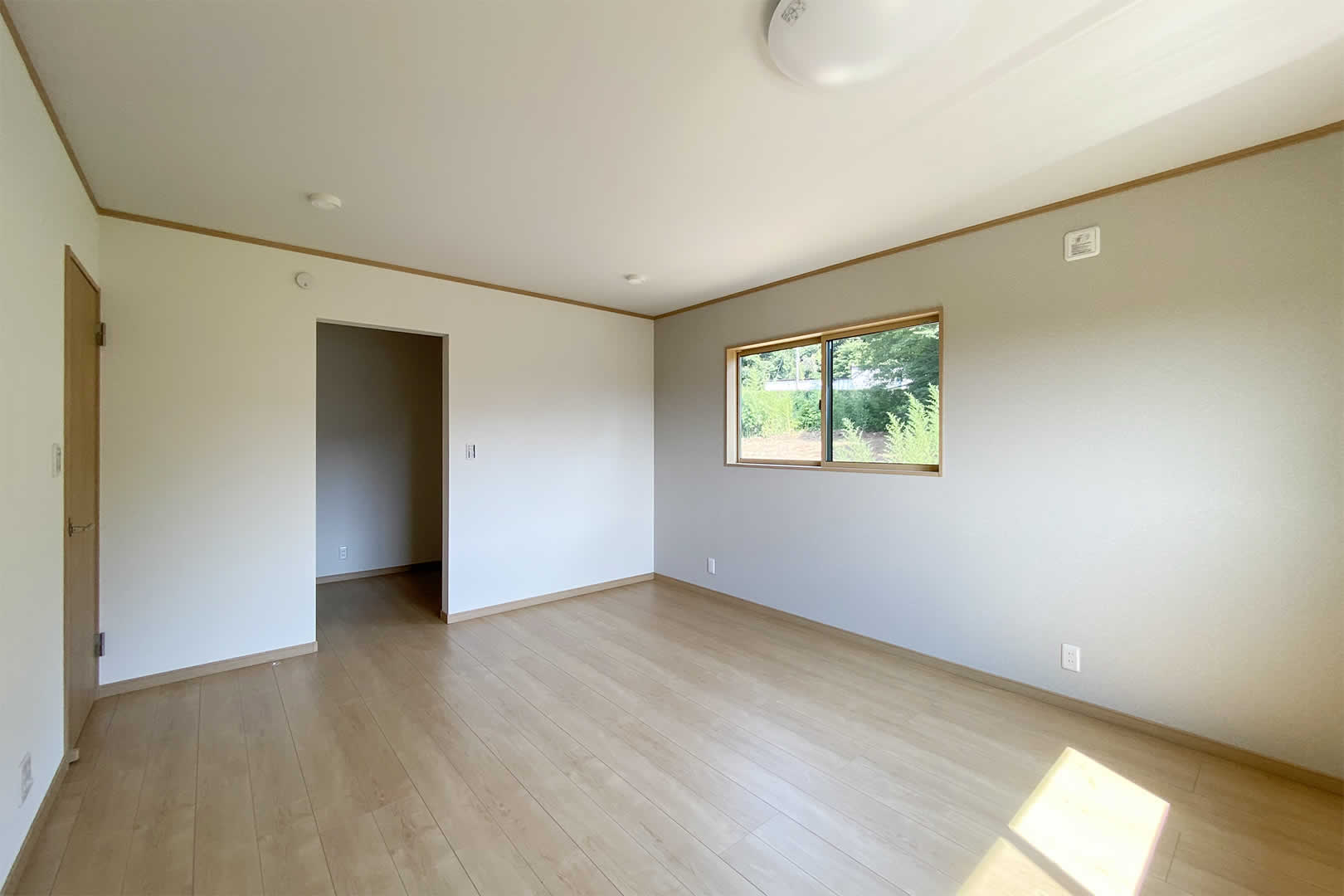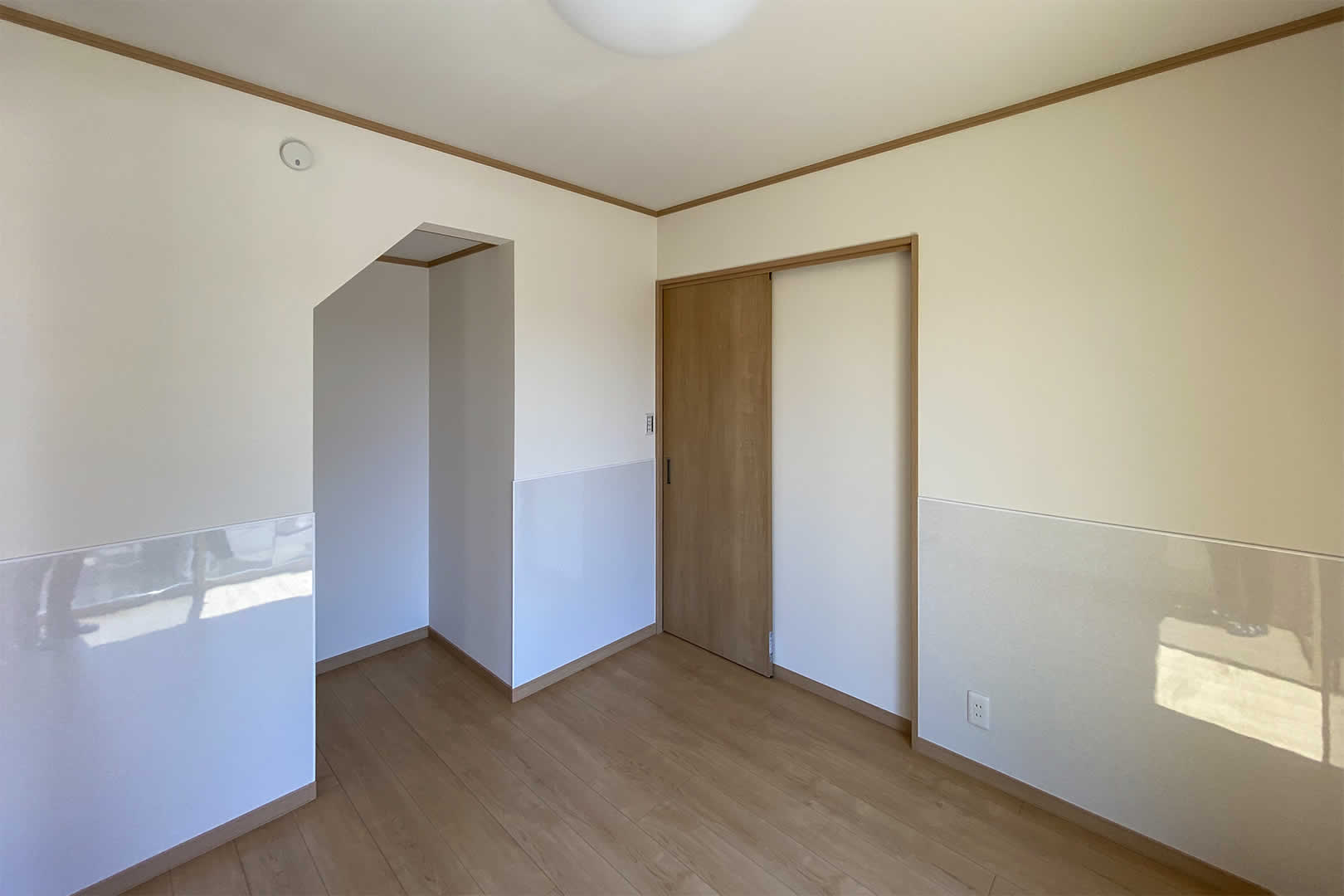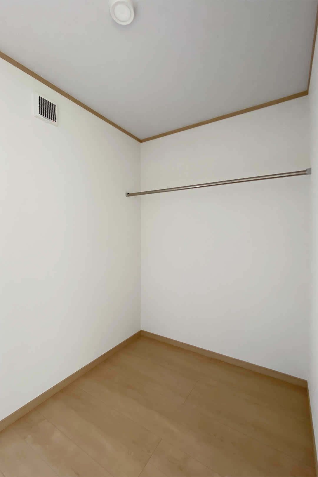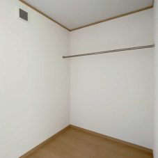 壁の一面にアクセントクロスを貼って温かみのある空間にしました。3帖分あるウォークインクローゼットにはパイプを付けて沢山の収納が出来ます。
