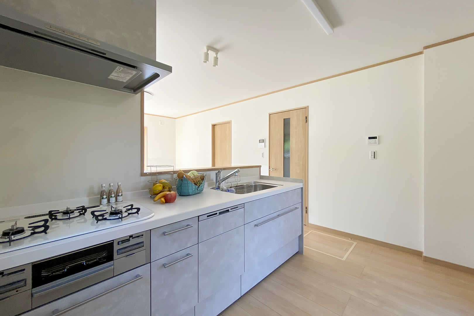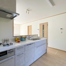 大理石風の大人のデザインのグレーのキッチン。明るい雰囲気のキッチンです。