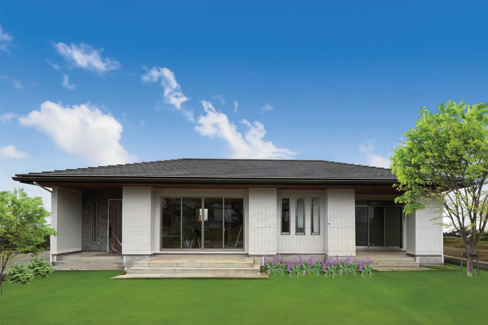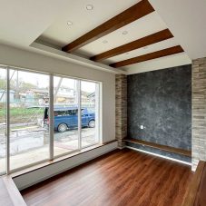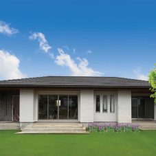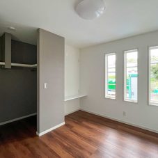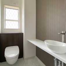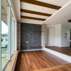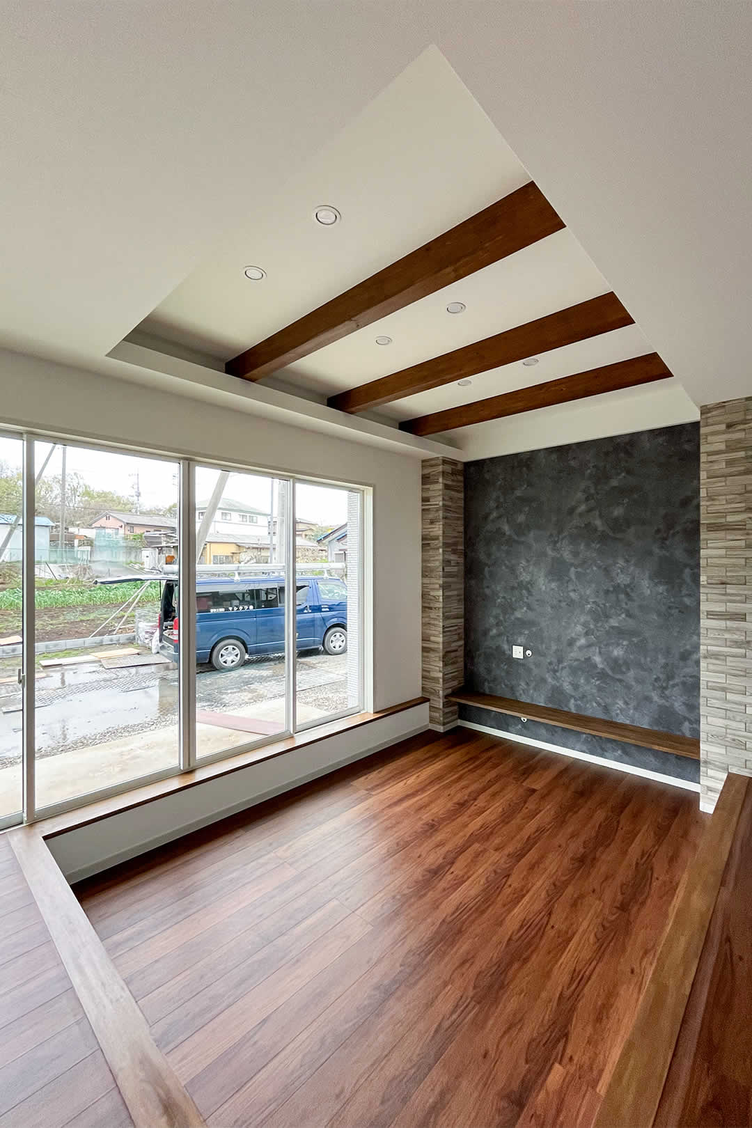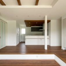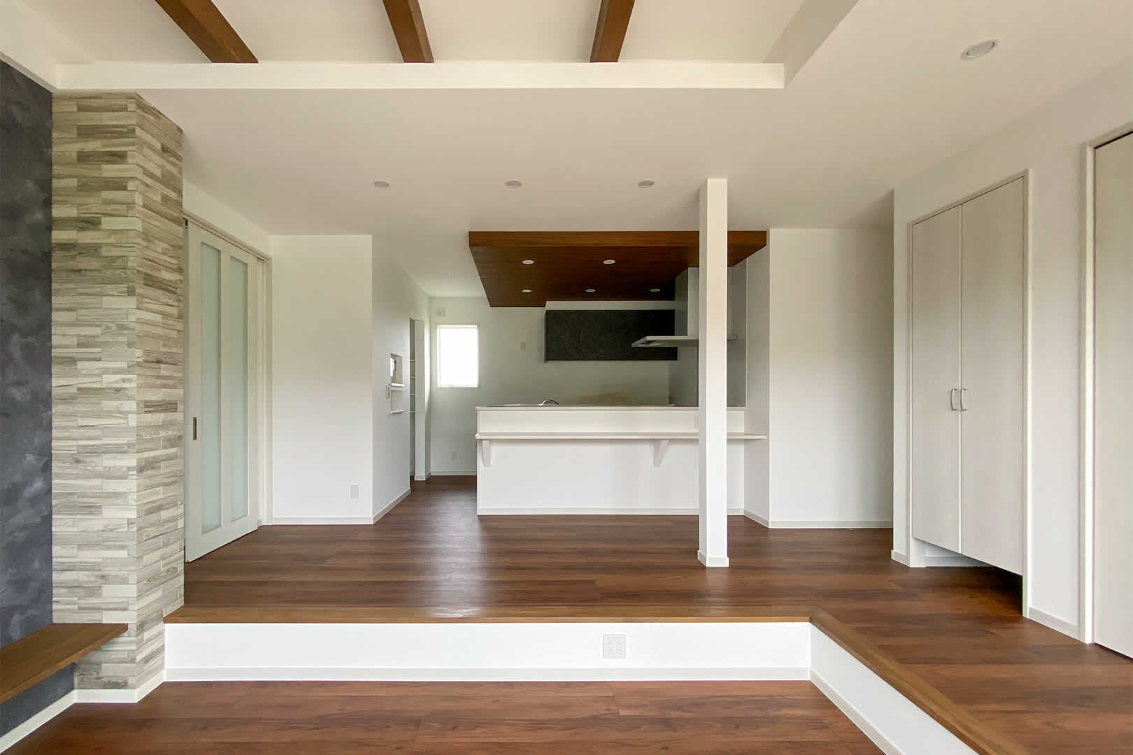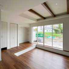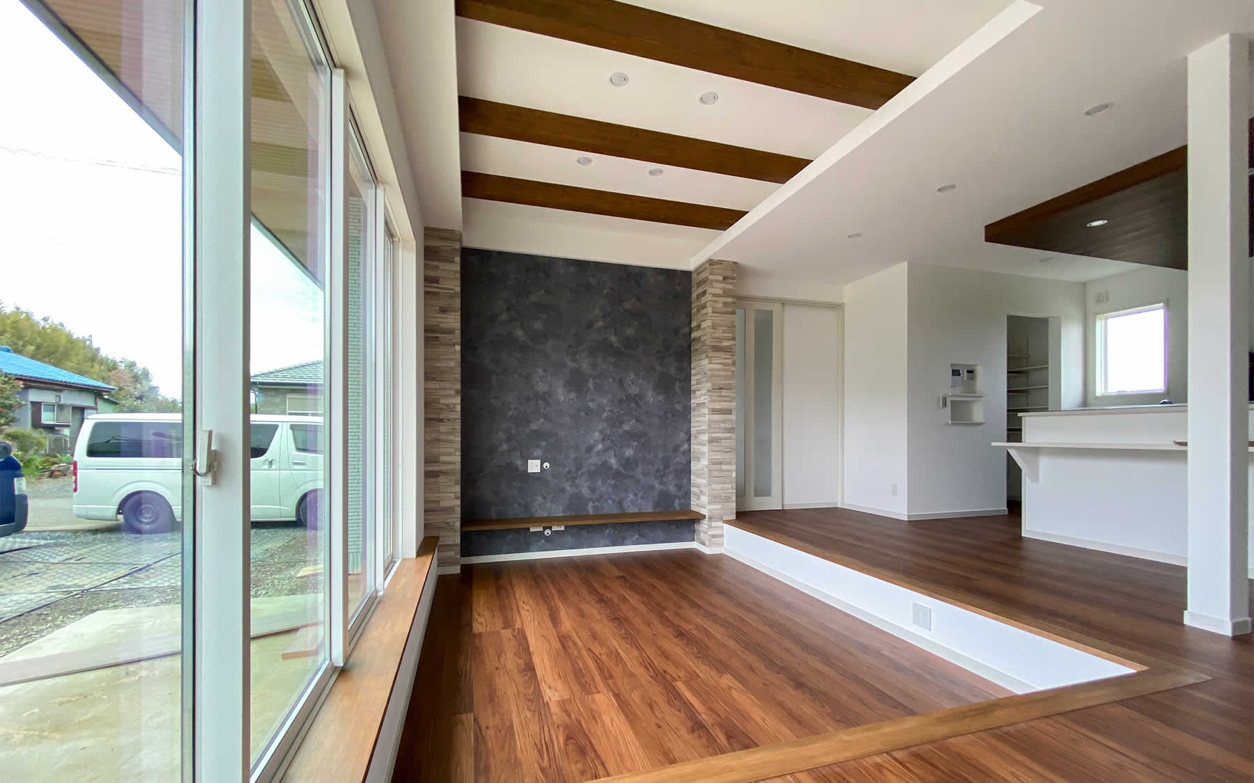 リビングの床を他の床より一段下げたダウンフロアに仕上げ、リビング天井の中央部分を周りの天井より一段高くとった、折り上げ天井に仕上げました。床から天井まで3m超えているので、光と風を通しやすくした空間使いを上手く作り出すことができました。