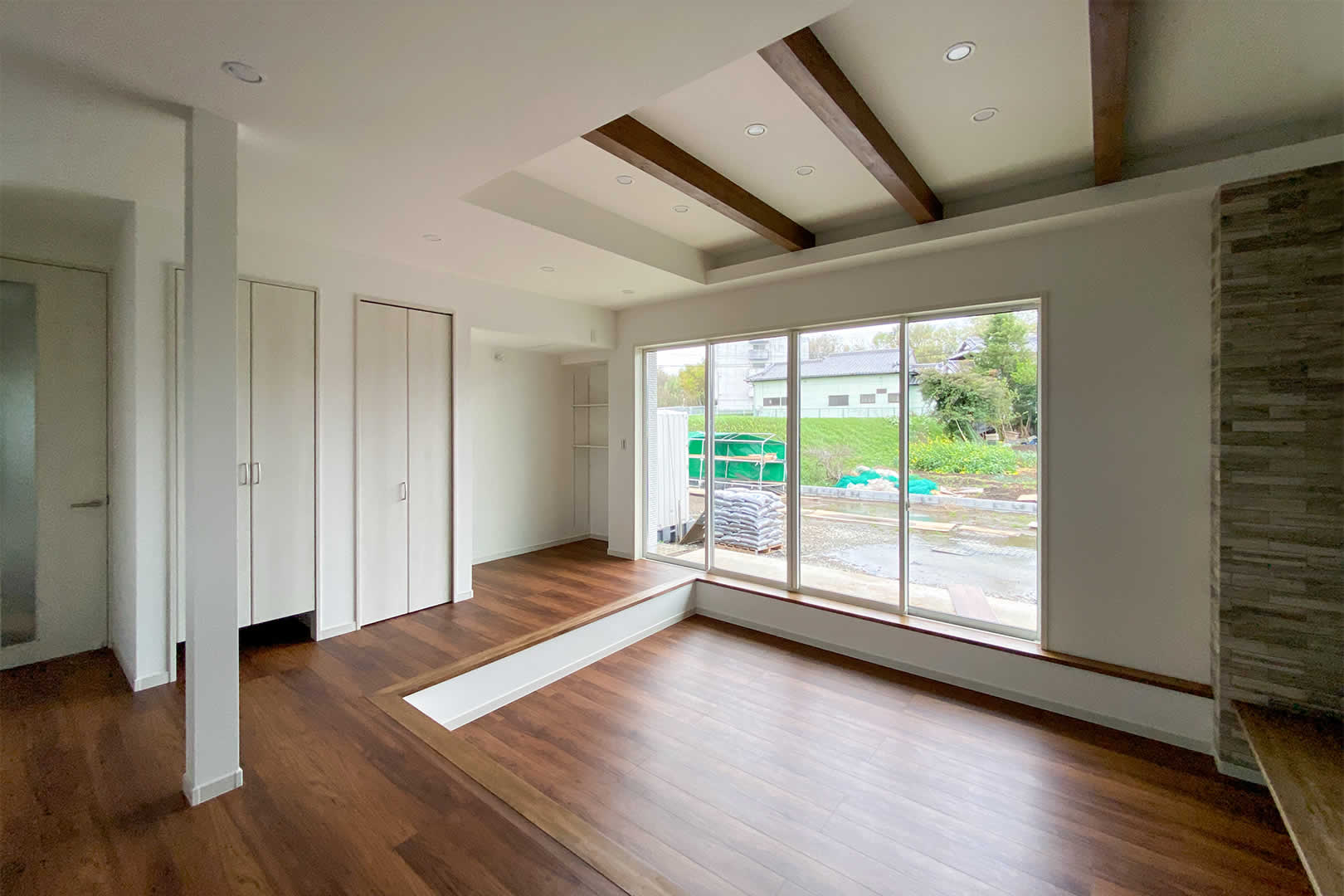 大開口サッシのため開放感がハンパない。横幅が標準サイズより2倍大きいので光が入りやすく、明るいリビングになります。こだわりの窓です。