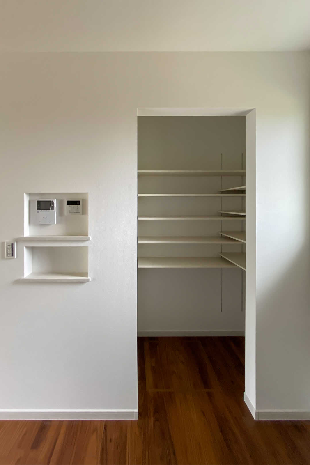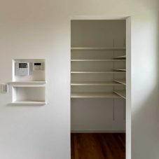 キッチンから10歩以内で使いやすい位置で考えました。自宅で食事をする機会が増えた分、ストック品は必須アイテム。ウォーターサーバーのボトルもパントリー内に収納出来てスッキリ。
