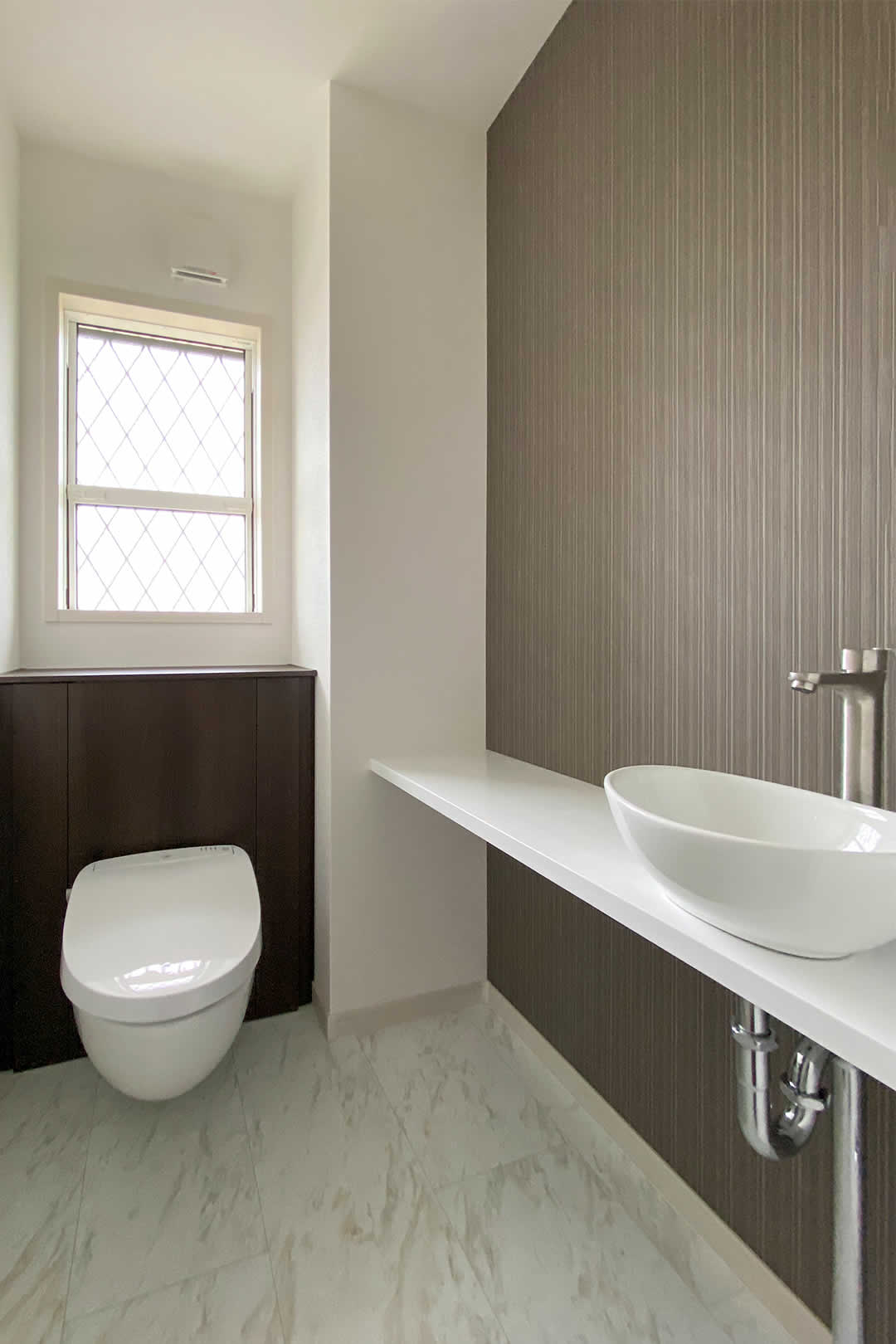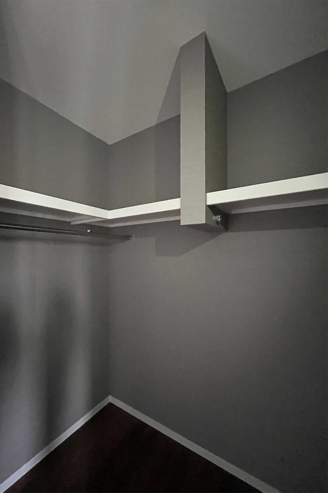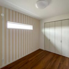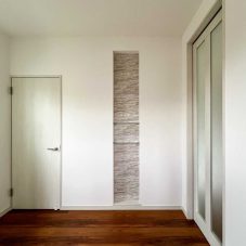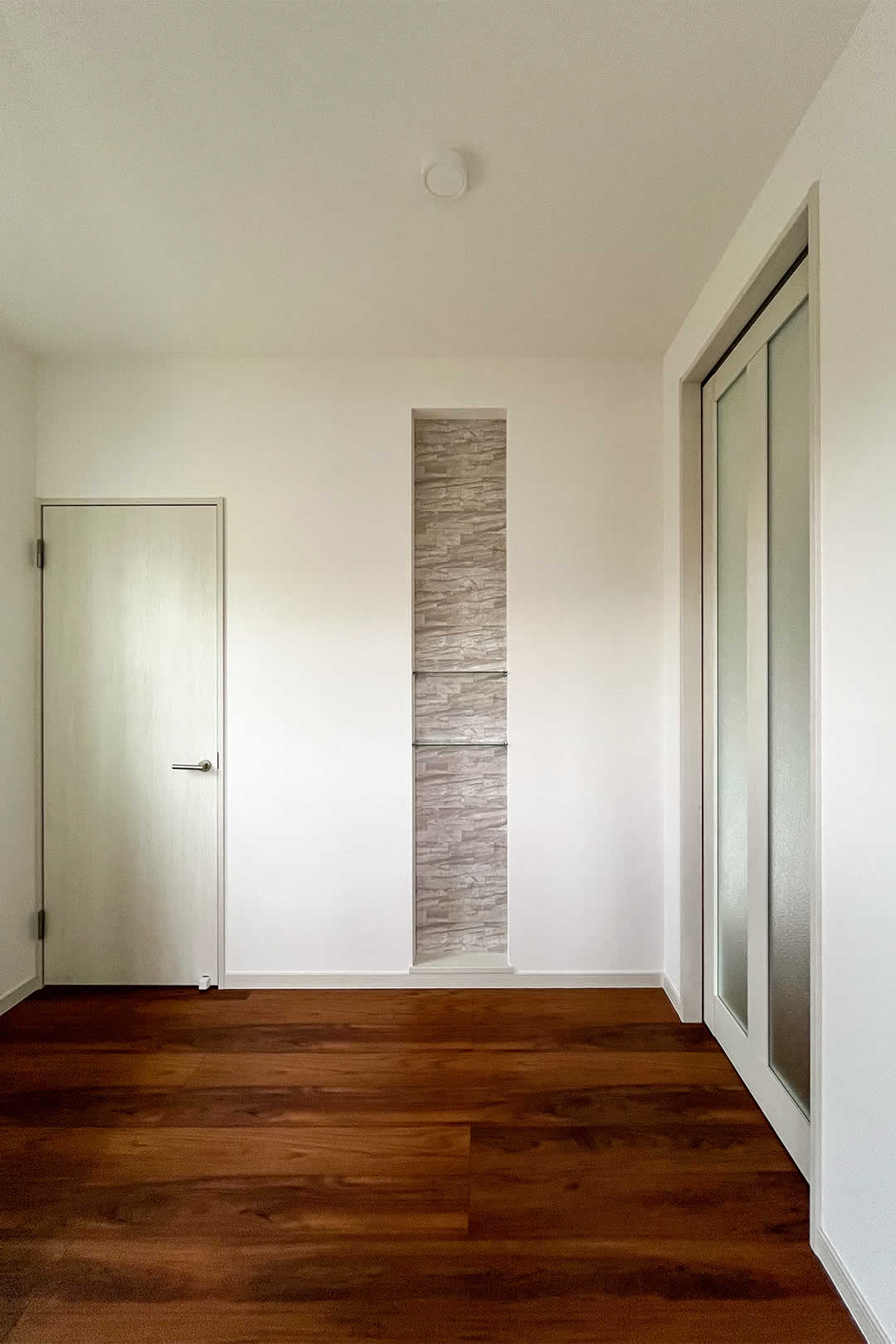 玄関ドアを開けるとストレートのニッチが正面にあり、お出迎えしてくれます。ガラス棚には、一輪挿しを飾ります。ニッチ後ろの壁はアクセントクロスで引き締めます。