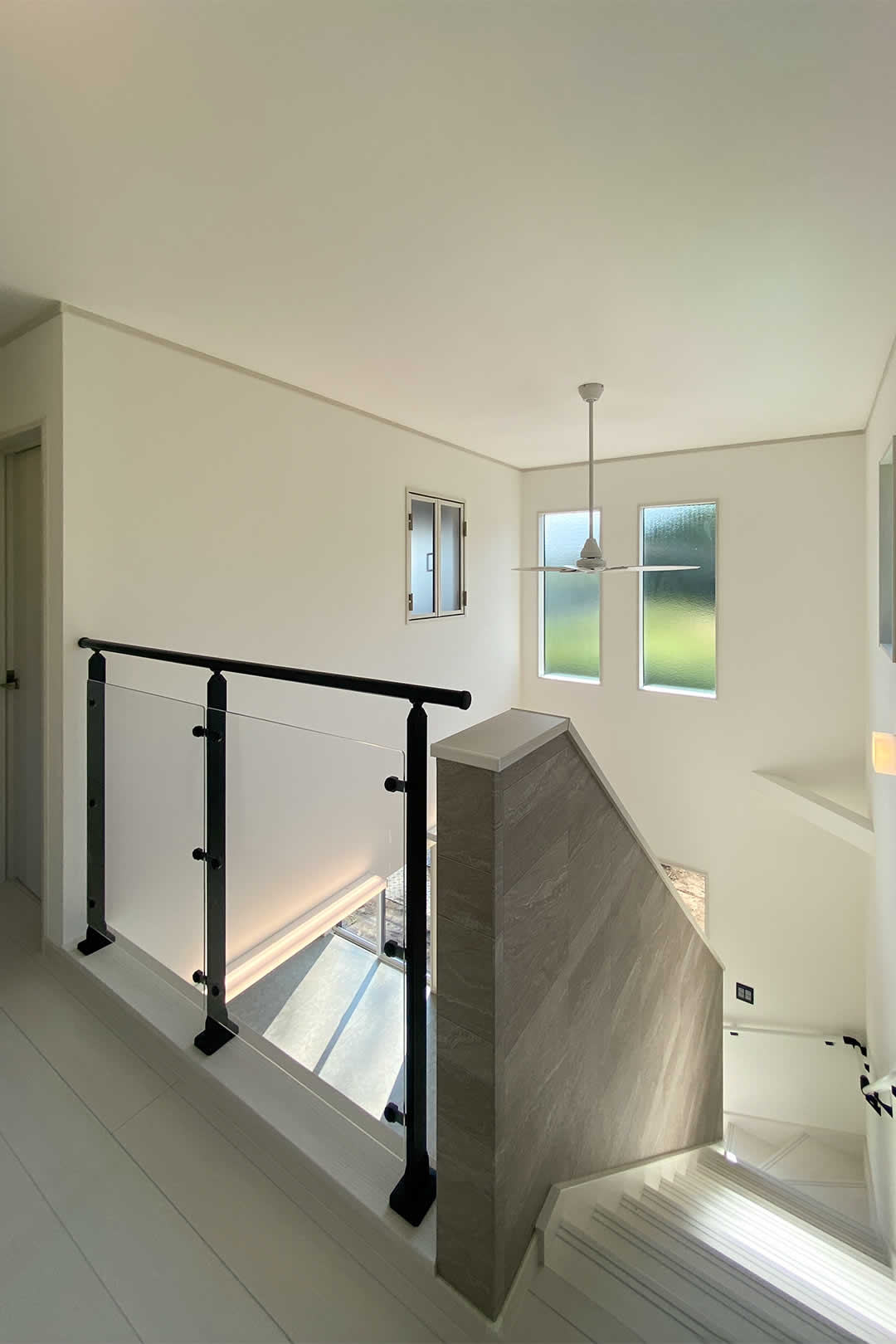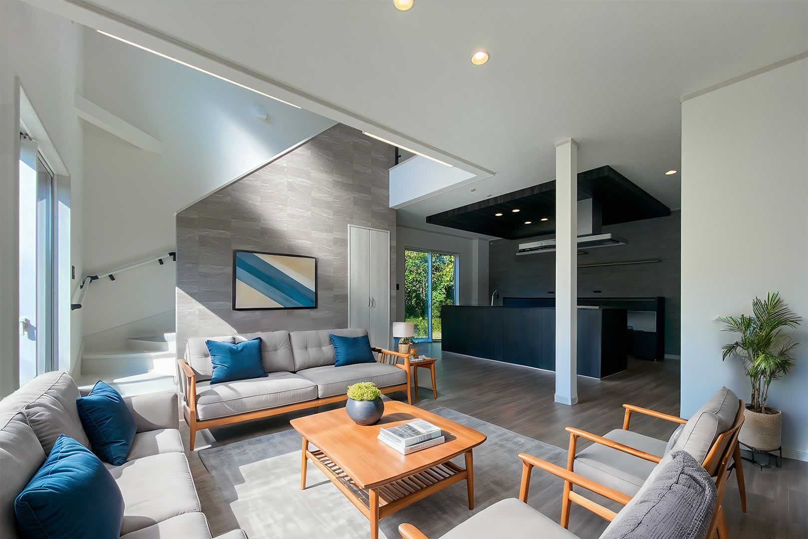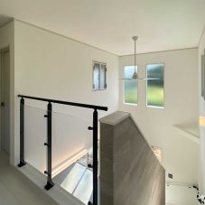 リビング内に階段を作ったので必ず顔を合わせられ、2階吹き抜け部分の壁もクリアにしました。いつも家族の気配を感じることができる、欲しかったリビングができました。