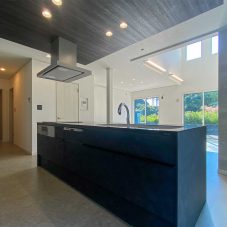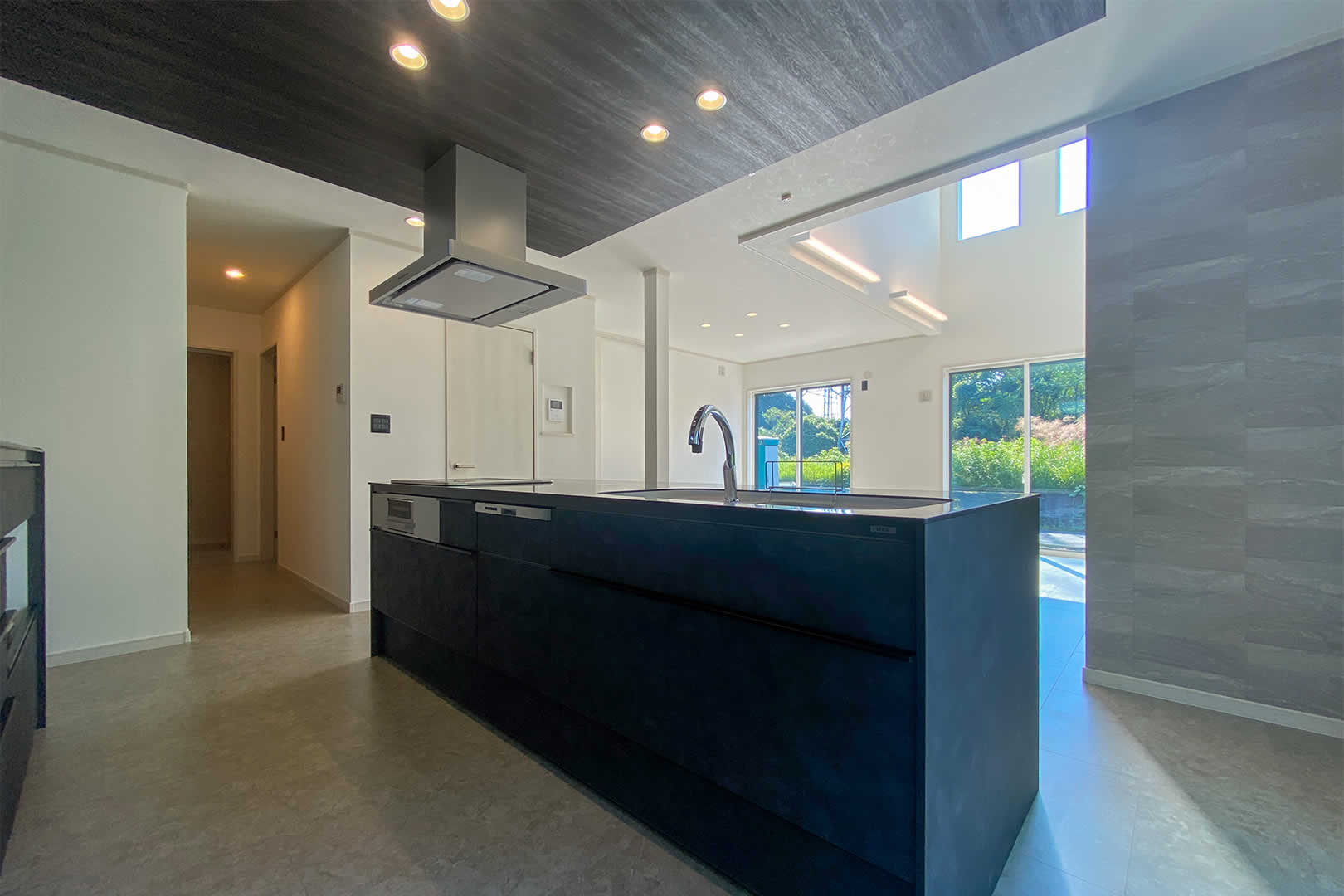 アイランドキッチンを採用しました。木目調のクロスで仕上げた下がり天井は空間にアクセントをつける演出にピッタリ。おしゃれで開放的な空間を演出してくれます。また、家族と料理を楽しんだり、友人たちとホームパーティーの時でも複数人で同時に料理ができるのも魅力的です。