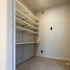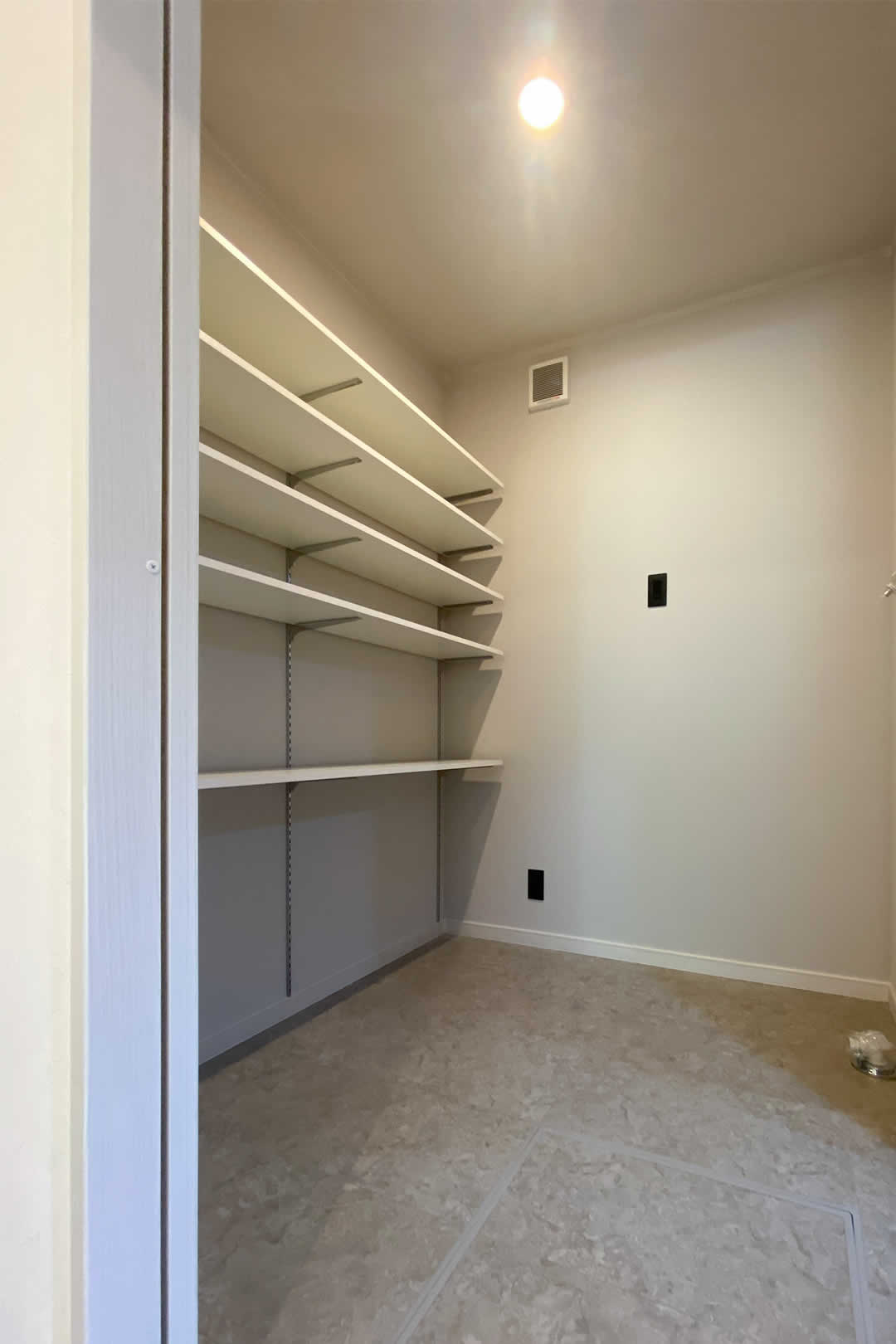 キッチンから一直線で行けるランドリールーム。壁一面に棚を付けてタオルや着替えはもちろん、洗濯洗剤や上履き・作業着用の洗剤、ハンガーなどがしまえます。
