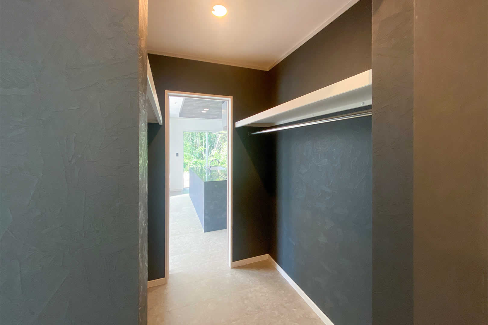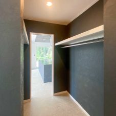 ランドリールームから7歩でファミリークローゼットへ。洗う→干す→たたむ→しまうが一気にできて時短につながります。