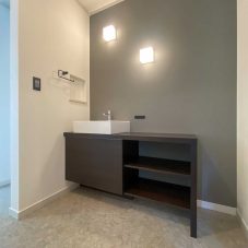 デザインと機能性にこだわり、おしゃれな洗面台にしました。洗面室は歯ブラシやタオル、化粧品など収納したいアイテムがたくさんあります。アイテムに合わせた収納ができるのでスッキリとまとまります。