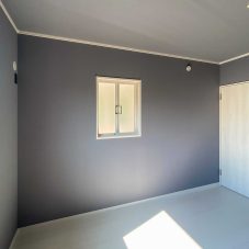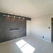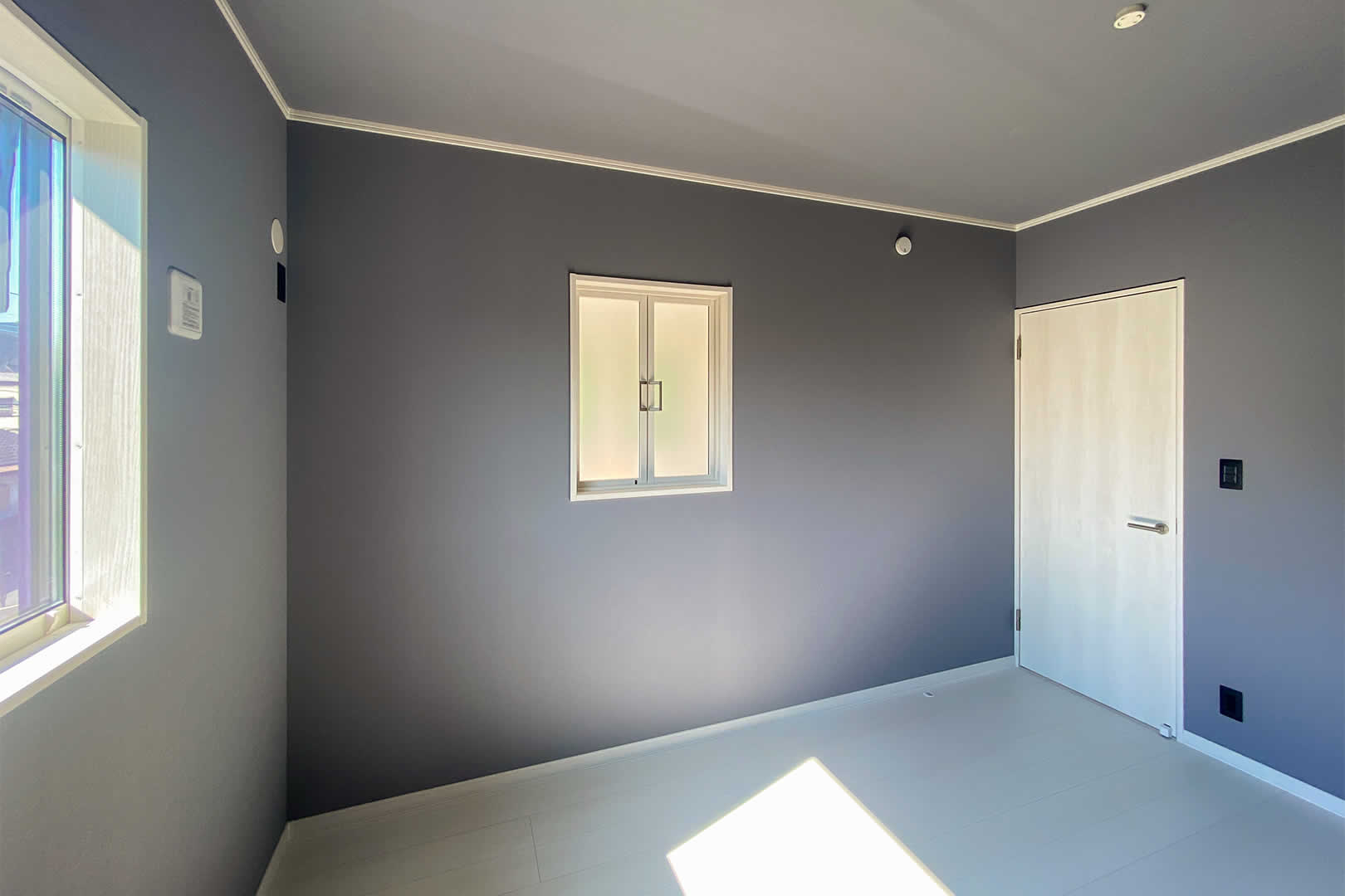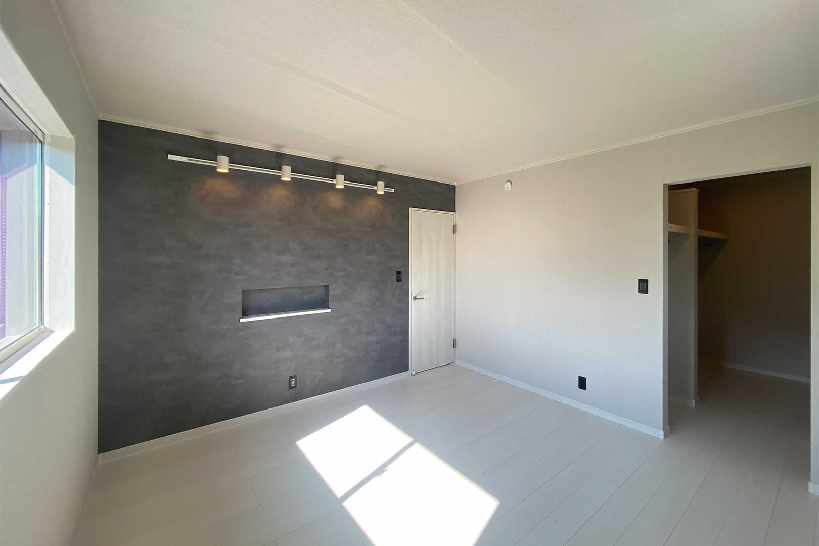 アクセントクロスで、床とドアなどの白を強調しつつバランスを保ってくれます。スイッチ・コンセントカバーも黒を採用したのでメリハリもあります。