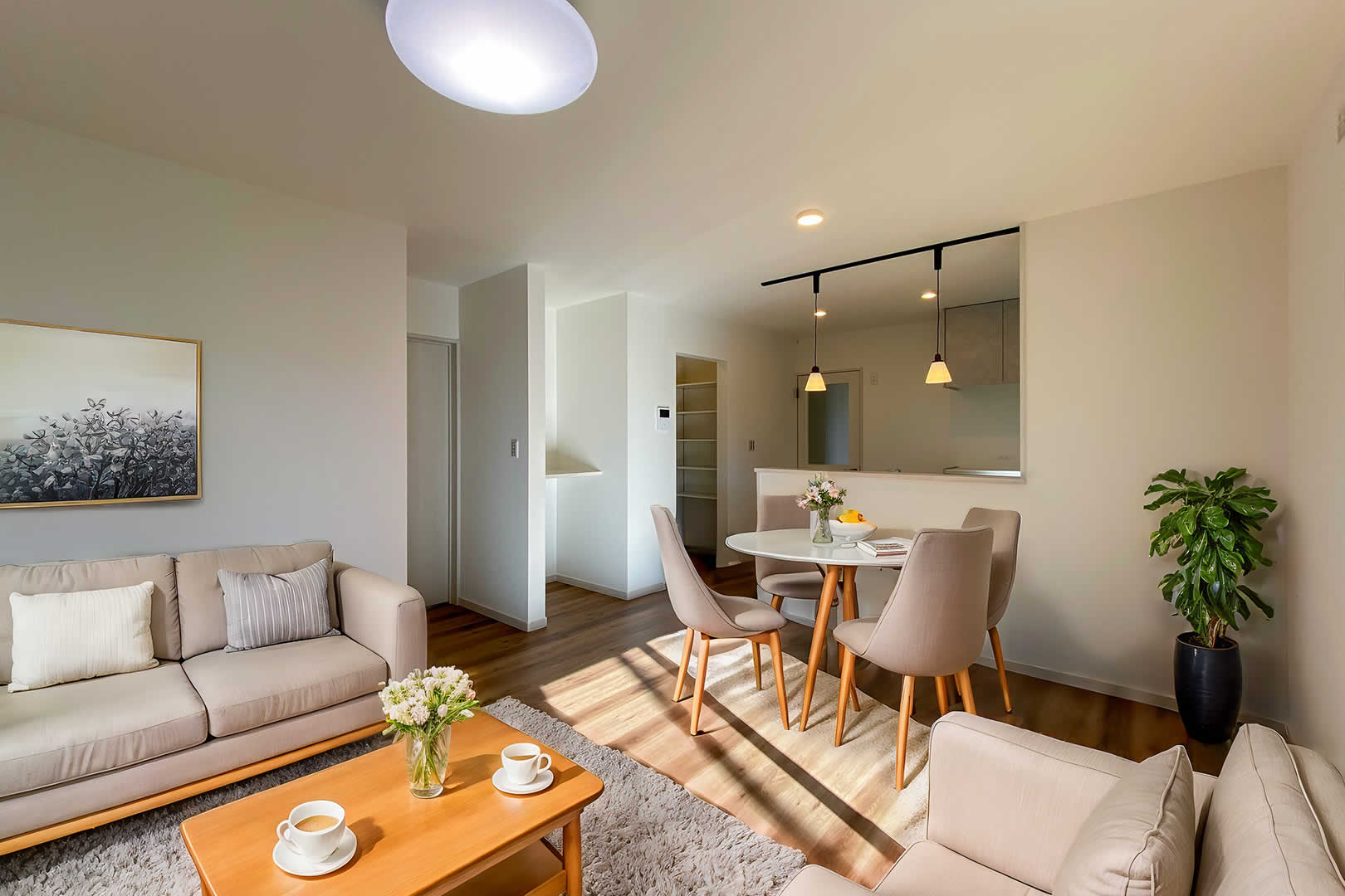 南側に家族が集まる14帖のLDKを作りました。日当りが良く、ぽかぽかな部屋で家族時間が自然と増えていきます。ペットスペースもリビングに作ったので、いつでも家族と触れ合えます。