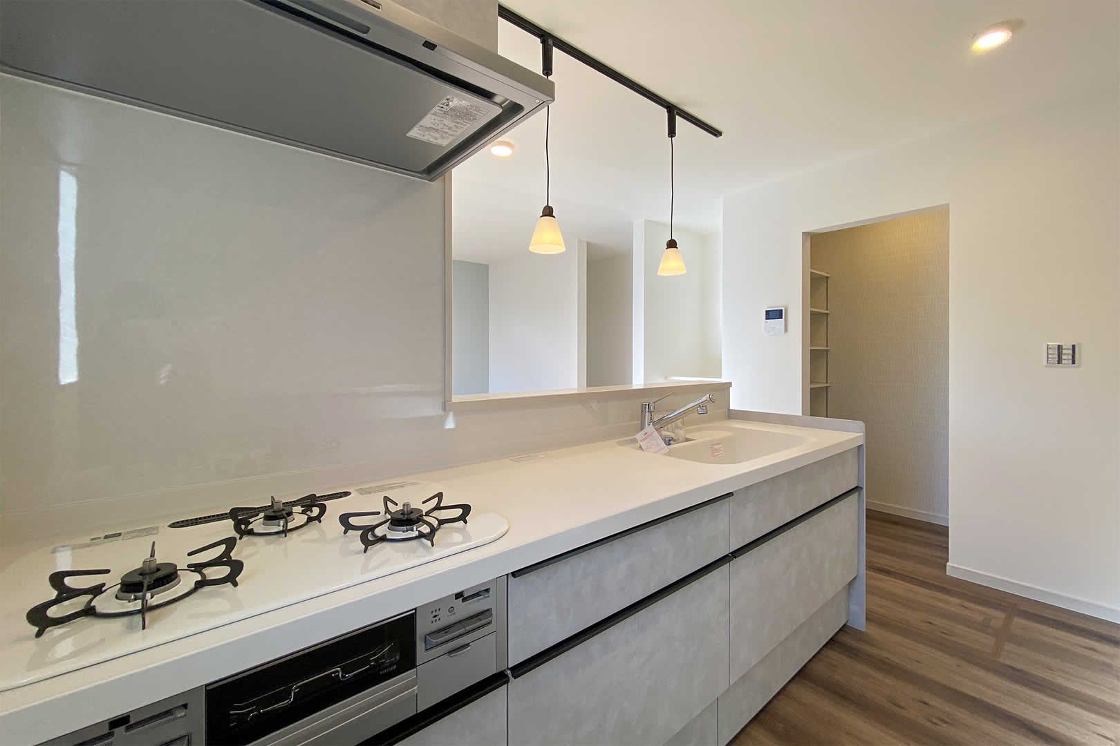 高さが変えられる棚になっているので自分好みにカスタマイズできます。キッチン横に設けたのでストレスフリー。