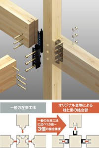 一般的な在来工法の住宅で、万一地震や台風などの応力を受けたとき、最も力が集中する場所が接合部です。在来工法の仕口や継ぎ手による接合は施工者の熟練度によって施工精度が左右される上、加工による木の欠損量が多くなるため強度が低下します。この接合部の強度を高めるため、独自開発の接合金物を採用。特に重要な柱と梁の接合には金物の奥行きを従来の約1/2にコンパクト化したHSS金物を使用し、接合部の欠損量を最小限に抑えます。また、柱と土台の接合には一般的なホールダウン金物より引き抜く力に強い柱脚金物を採用して耐震性能を高めています。これにより在来工法に比べて約1.5倍~3倍の強度を実現しました。
