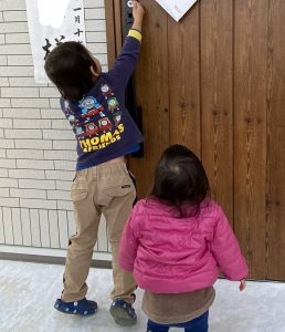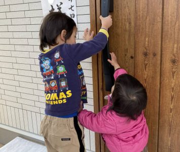 Yちゃんが見守るなか、Yくん頑張って鍵を開けています