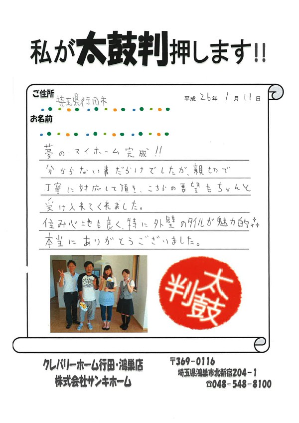 夢のマイホーム完成!! 分からない事だらけでしたが、親切で丁寧に対応していただき、こちらの要望もちゃんと受け入れてくれました。 住み心地も良く、特に外壁のタイルが魅力的☆ 本当にありがとうございました。