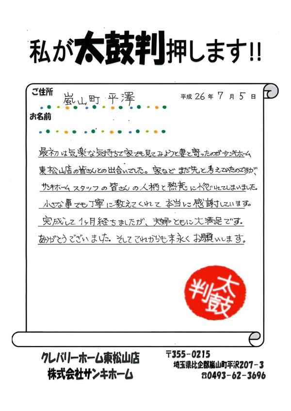 最初は気楽な気持ちで家でも見てみようと妻と寄ったのがサンキホーム東松山店のみなさんとの出会いでした。