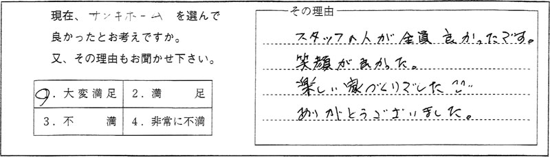 スタッフの人が全員良かったです。 笑顔が良かった。 楽しい家づくりでした(^_^) ありがとうございました。