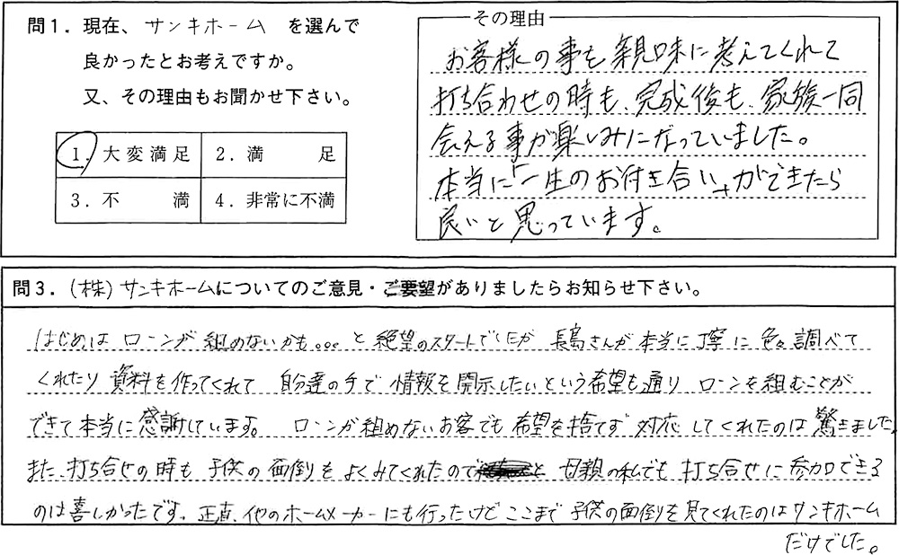 お客様のことを親身に考えてくれて、打ち合わせの時も完成後も家族一同会える事が楽しみになっていました。