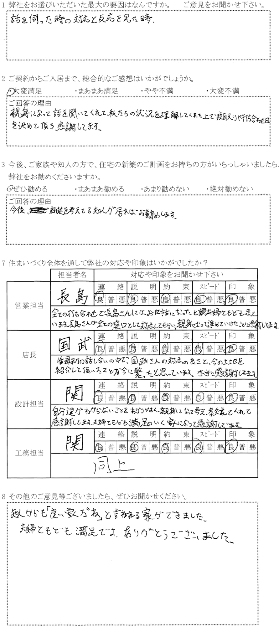 自分達がわからないことをわかりやすく親身になって考え教えてくれて感謝してます。夫婦とも満足のいく家になって感謝してます。工務担当 関