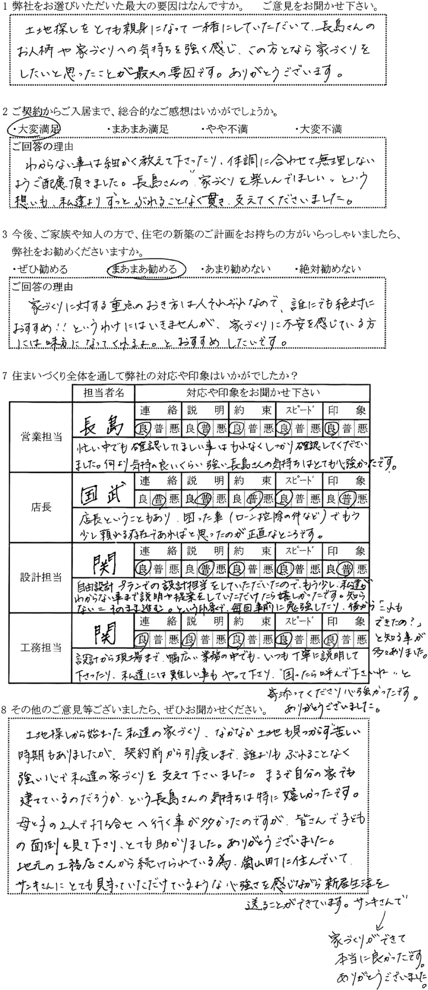 土地探しをとても親身になって一緒にしていただいて、長島さんのお人柄や家づくりへの気持ちを強く感じ、この方となら家づくりをしたいと思ったことが最大の要因です。ありがとうございます。
