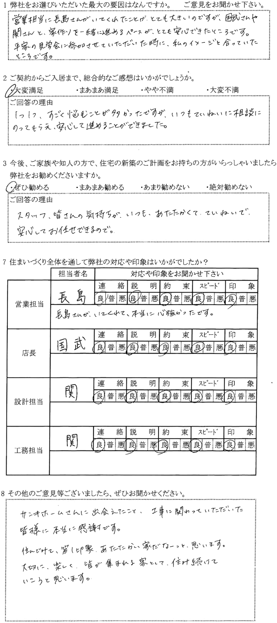 営業担当に長島さんがいてくれたことが、とても大きいのですが、国武さんや関さんと家作りを一緒に進めるペースが、とても安心できたところです。